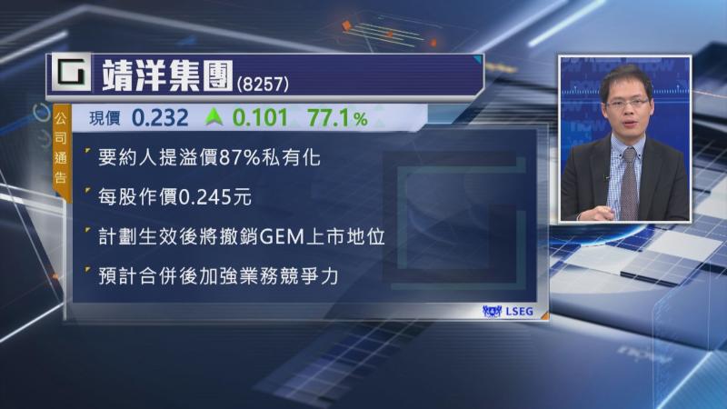 【Now財經台】GEM板公司靖洋集團(08257)今日(17日)復牌,股價一度逆市飆逾80%,應該同一個消息有關,集團獲美資集團Watlow Electric Manufacturing提私有化,每股作價0.245元,較停牌前有87%溢價,點解靖洋會被美國公司睇中?