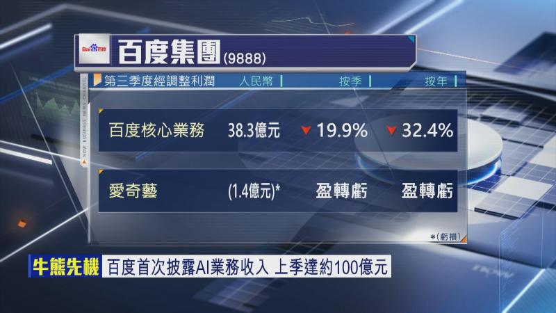 【Now財經台】百度集團(09888)昨日(18日)派咗第3季成績表,其中,收入按年跌7%,錄得有紀錄以來最大單季跌幅,經調整純利按年跌36%,值得留意係,集團首度披露人工智能(AI)新業務表現,收入按年大升逾50%。百度股價今朝(19日)一度升3.8%,高見115.7元。點睇百度呢份成績表及股價後市?