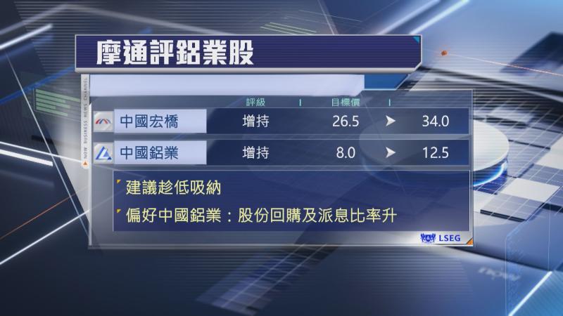 此外,大摩上調宏橋及中鋁目標價,認為鋁業股前景仍然明朗,在儲能需求上升、供應面對挑戰、內地鋁材庫存仍偏低下,企業盈利仍有上升空間。