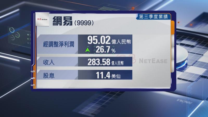 截至9月底止第3季,按非公認會計準則,網易經調整淨利潤逾95億元人民幣,按季跌不足1%,收入283億元人民幣,按年及按季分別增長8%和1%,派季度息11.4美仙。