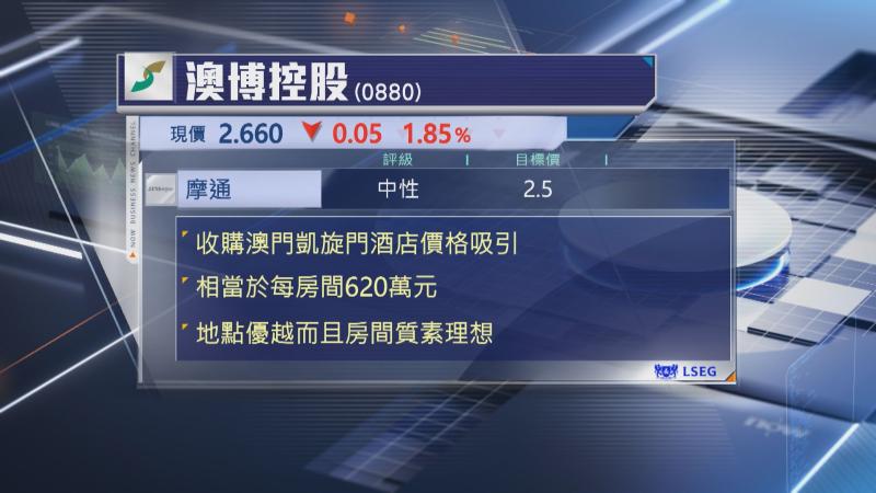 摩通指,雖然收購對集團正面,但考慮到現時的市況,仍未看到澳博業務可明顯跑贏同業的空間,維持「中性」評級及2.5元目標價,而目標價是低於現價。