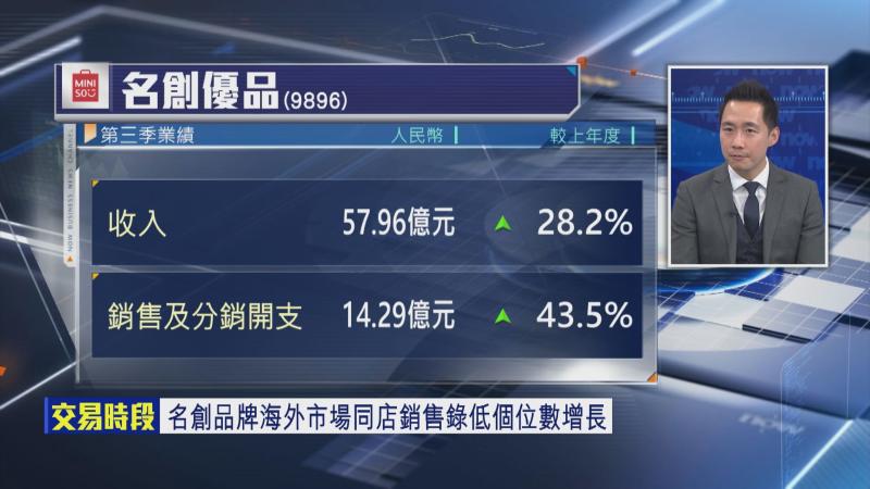 【Now財經台】名創優品(09896)今日(21日)中午派咗成績表,股價午後一度急挫近5%,低見38.28元,市場係咪唔滿意呢份業績?雖然上季收入按年增長逾28%,整體同店銷售亦維持中個位數增長,但純利就按年跌31%,主要受投資直營門店令銷售及分銷開支大升,點睇呢份業績?