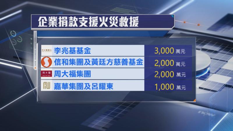 本地企業方面,恒基地產(00012)表示,李兆基基金將捐款3000萬元,信和集團及黃廷方慈善基金,以及周大福集團均捐出2000萬元。