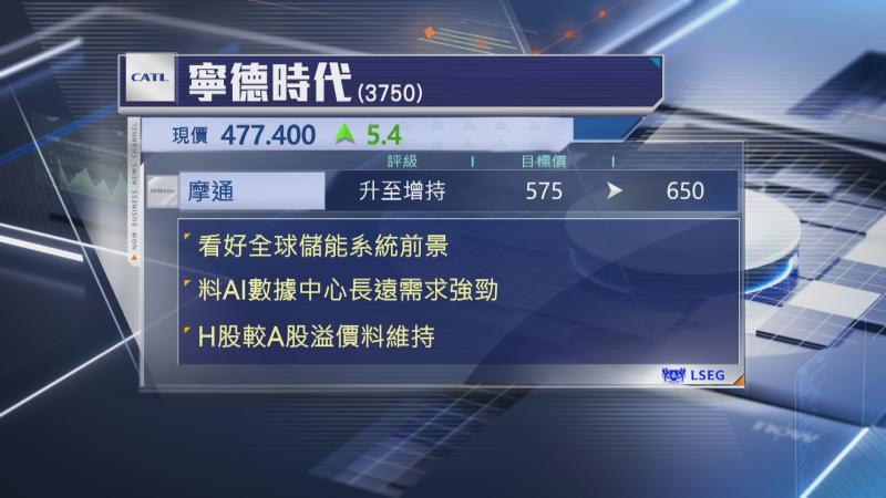 摩通又估計,人工智能(AI)數據中心長遠需求強勁,上調寧德明年盈利預測,並指在基石投資者解禁期限前,寧德H股會較A股有27%溢價,現時已降至15%,但該行相信,以企業在全球電動車供應鏈的稀有性及行業的領先地位,認為寧德H股較A股溢價可維持於15%至20%水平,調高評級至「增持」,目標價則上調至650元。
