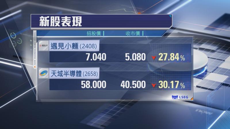 此外,碳化硅外延片製造商天域半導體(02658)開市報38元,見了全日低位,較招股價58元,低逾34%,收市報40.5元,低招股價30%,每手50股,不計手續費,1手帳蝕約875元。