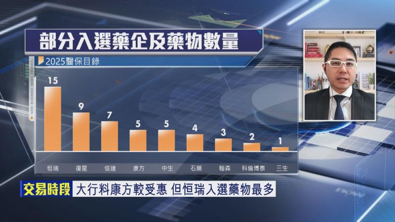 【Now財經台】內地公布最新一版國家醫保目錄名單,新增114種藥物,有19種則獲納入「商業健康保險創新藥名單」,其中,恒瑞醫藥(01276)入選藥物最多,共有15種,其次係信達生物(01801),共有7種,依家係咪入手呢兩隻醫藥股嘅好時機?