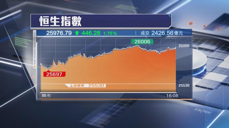 【Now財經台】本港股市顯著造好,恒生指數飆逾400點,一度升穿26000關。