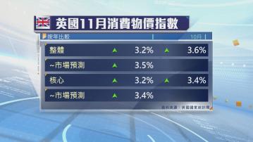 英國11月消費物價指數(CPI)按年升幅,由10月的3.6%大幅放緩至3.2%,升幅是8個月以來最小,期內,扣除食品、能源、酒類及煙草價格的核心CPI,升幅放緩至3.2%。