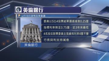 英倫銀行結束今年最後一次議息會議後,宣布減息0.25厘,指標利率降至3.75厘,是近3年以來最低水平,亦是今年第4度減息,符預期。