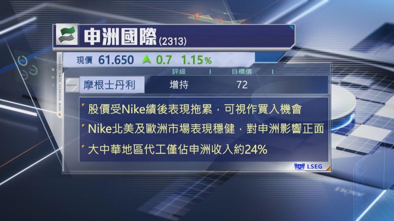 【Now財經台】Nike公布業績後,股價當日急瀉逾10%,拖累申洲國際(02313)股價,不過,摩根士丹利維持申洲目標價及評級不變。