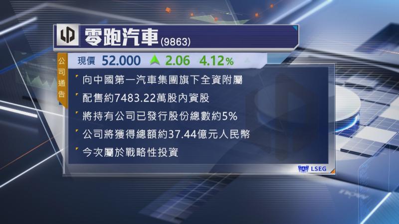 零跑向一汽旗下全資附屬配售逾7483萬股內資股,配股價50.03元人民幣,完成後,一汽將持有零跑已發行股份總數約5%。