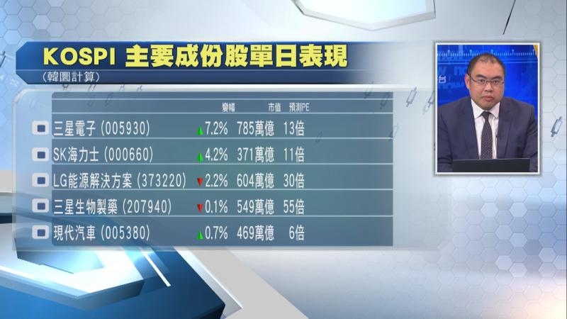 高富金融集團投資總監梁偉民指出,KOSPI指數衝高,全靠幾隻大市值的科技類股份,例如三星電子單日大升超過7%,SK海力士亦升了超過4%。相反,被北美多家車廠砍訂單的電池及儲能設備製造商LG能源解決方案,就跌了2%,三星生物製藥同樣表現遜色。梁偉民認為,在科技股炒作下,南韓股市有力再上,但波動亦會隨之擴大。