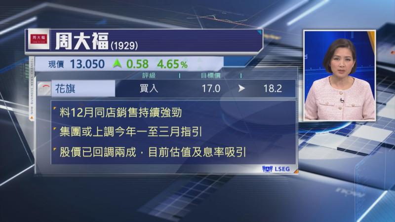 花旗又估計,內地增值稅政策調整後,將有利集團2026下半財年及2027上半財年毛利率表現,該行預期,周大福甚至有機會上調2026年1月至3月同店銷售指引,將目標價由17元上調至18.2元,維持「買入」評級。