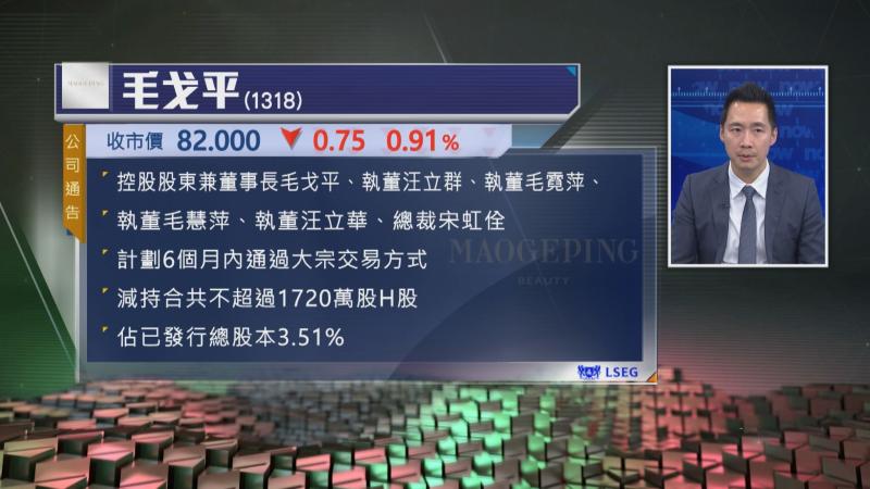 【Now財經台】毛戈平(01318)董事長及另外五名執董,計劃合共減持最多1720萬股H股。