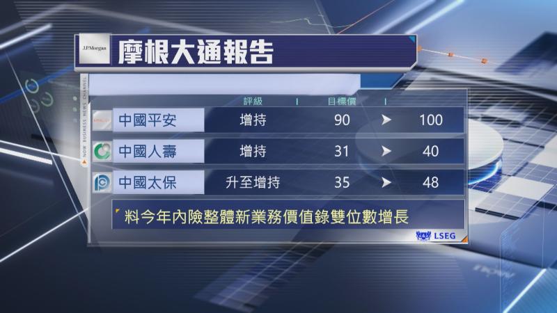 【Now財經台】摩根大通上調內險股目標價,其中,中國平安(02318)上調至100元,是全城第2牛,中國人壽(02628)目標價調高29%至40元。此外,中國太保(02601)評級「增持」,上調目標價37%至48元,以反映業務復甦。