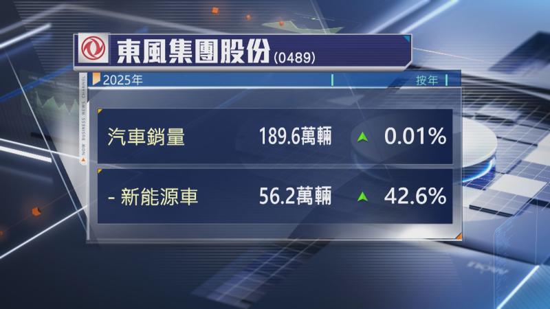 【Now財經台】東風集團股份(00489)2025年新能源車銷量按年增長逾42%至56.2萬輛。