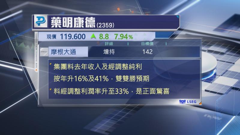 摩通又預期,藥明康德去年經調整利潤率上升6個百分點至33%,是正面驚喜,市場後續關注公司披露毛利率及訂單狀況,以及美國通過修訂版的《生物安全法案》帶來的潛在影響,重申其「增持」評級及142元目標價。