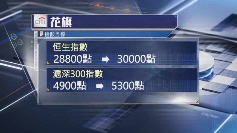 花旗預期,恒指內的公司每股盈利增幅將由去年的2.2%,升至今年預測的9.1%,將恒指今年底的目標由原來28800點上調4%,至30000點,預測市盈率(PE)11.9倍,相比環球股市仍屬於偏低,滬深300指數目標亦上調。