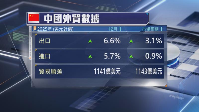 內地外貿去年底出乎預期強勁增長。海關總署公布12月以美元計價,出口升6.6%,進口升5.7%,進出口都見3個月以來最好表現,並遠好過預期,貿易順差擴大至1141億美元,全年累計出口增長5.5%,進口則持平,貿易順差再創新高,達1.18萬億美元。