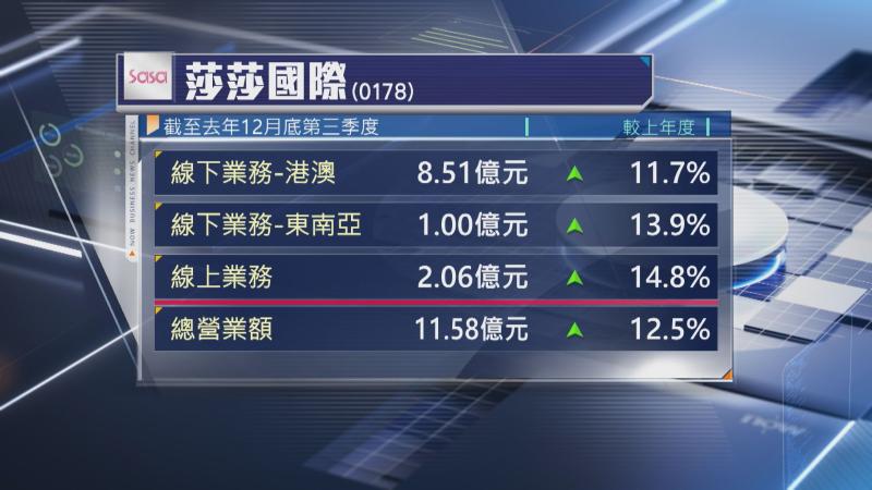 截至2025年12月底,第3季度莎莎國際營業額達11.58億元,升12.5%。集團指十一黃金周、超級購物節和聖誕節期間,集團加強與品牌合作方推出限時優惠,令線上、下業務營業額均錄得雙位數增幅。