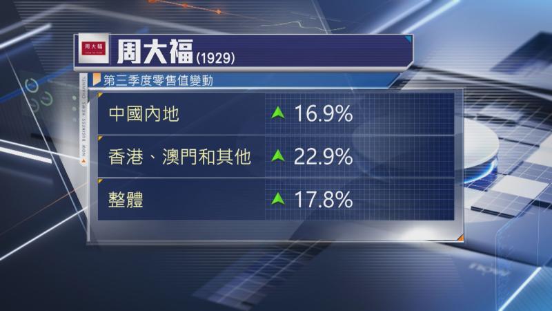 截至去年底止第3季度,佔周大福整體零售值84%的內地市場,零售銷售增長16%,香港、澳門和其他市場增長22%,期內內地同店銷售增約21%,港澳等地區增長14%。