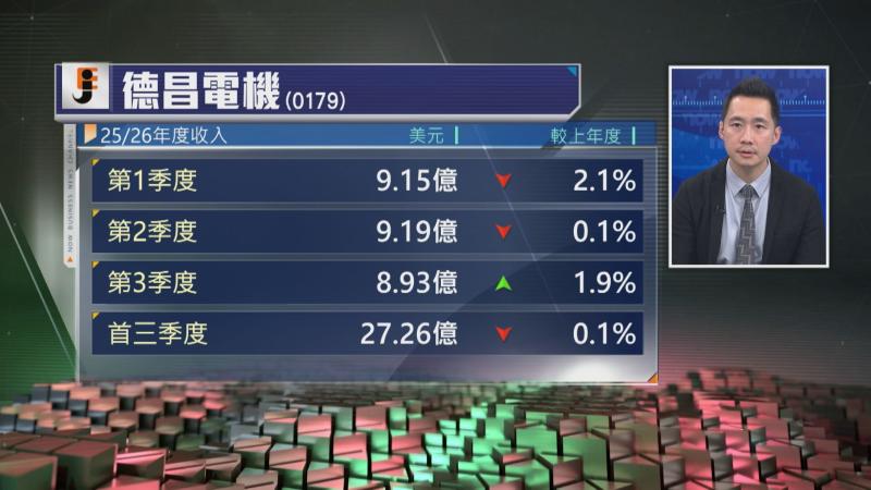 【Now財經台】德昌電機(00179)首三季收入微跌0.1%,預期全年收入與上財年大致相若。