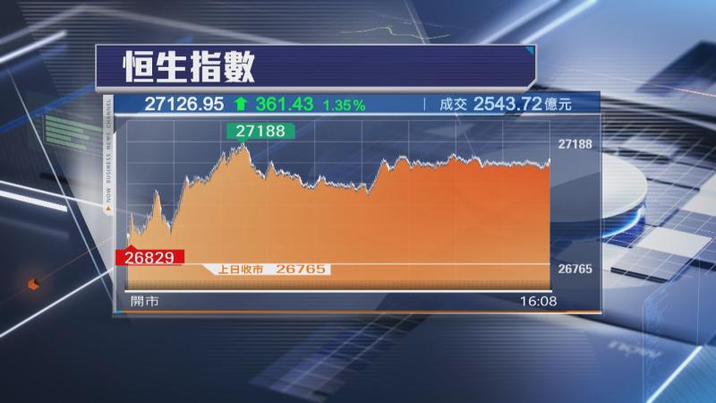大市今日(27日)高開97點後,升幅逐步擴大,最多升423點,高見27188點,午後升幅略為收窄,收市升361點,報27126點。大市全日成交縮減至逾2543億元。