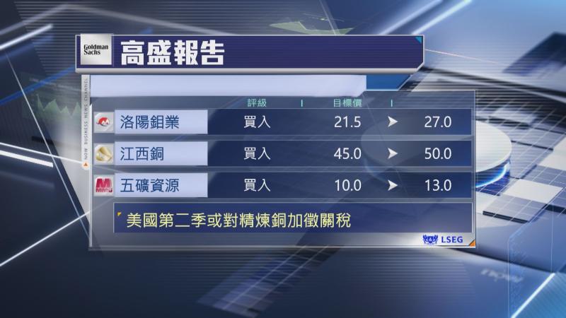 另一方面,高盛上調3隻銅業股目標價,分別是洛陽鉬業(03993)、江西銅業股份(00358)及五礦資源(01208),上調幅度介乎11%至30%,全部維持「買入」評級。