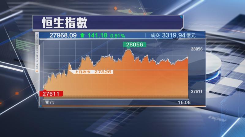 【Now財經台】本港股市於期指結算日造好,恒生指數7連升,更一度升穿28000關,收市升逾百點,繼續見逾4年半高位。
