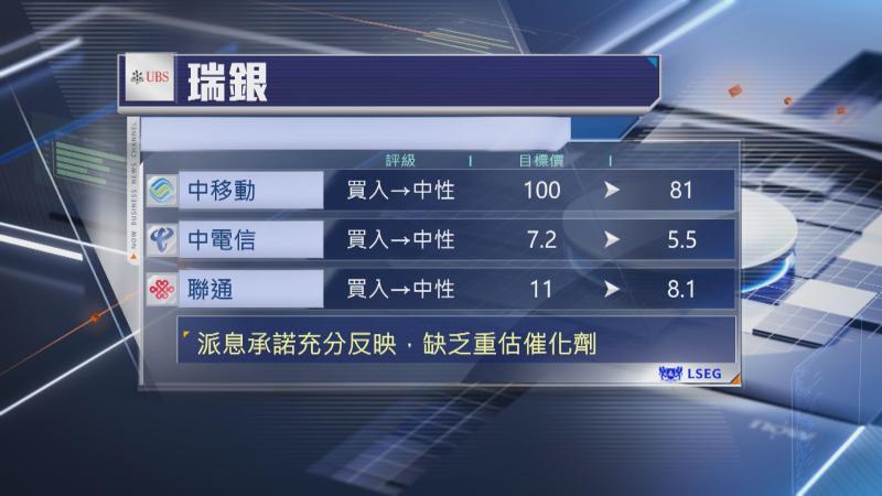 【Now財經台】瑞銀下調3大中資電訊股評級及目標價,評級全線由「買入」降至「中性」,目標價大削19%至26%。
