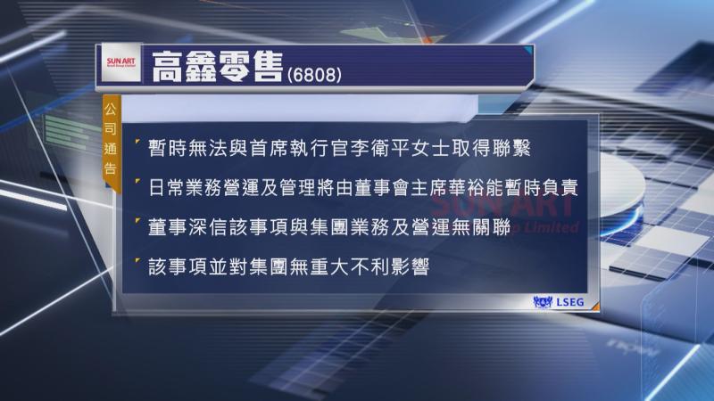 【Now財經台】高鑫零售(06808)表示,公司暫時無法跟首席執行官李衛平女士取得聯繫。