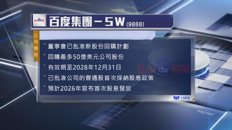 【Now財經台】百度集團(09888)董事會批准新股份回購計劃,並預期今年將會首度派息。百度股價今日(5日)走勢反覆,高開逾2%後,隨大市向下,一度跌逾1%,低見135.4元。