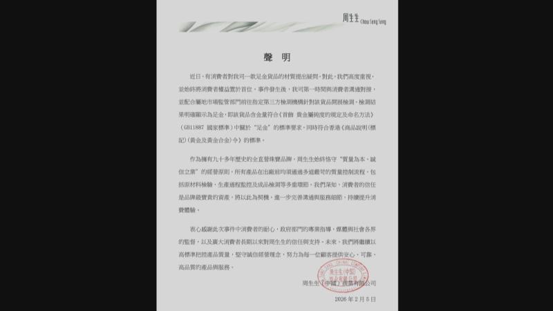 對於近日內地市場質疑集團旗下周生生中國出售的黃金產品含金量,周生生今日(6日)發聲明,指集團高度重視事件,並已完成調查,會配合內地市場監管部門,將涉事足金產品送往指定第三方檢測機構檢驗,結果顯示是正品足金,即產品含金量符合國家足金標準要求,亦符合香港《商品說明條例》對黃金及黃金合金的標準,期望檢測結果能釋除各界對產品安全與品質疑慮。