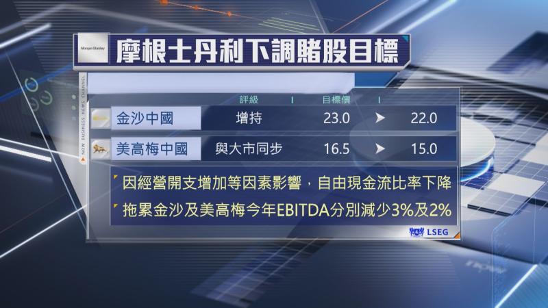 【Now財經台】摩根士丹利下調部分賭股目標價,其中,下調金沙中國(01928)及美高梅中國(02282)目標價4%和近10%,最新看22元及15元,但未有調整評級,主要是看淡兩家賭場營運商今年自由現金流比率(P/FC)或下降。