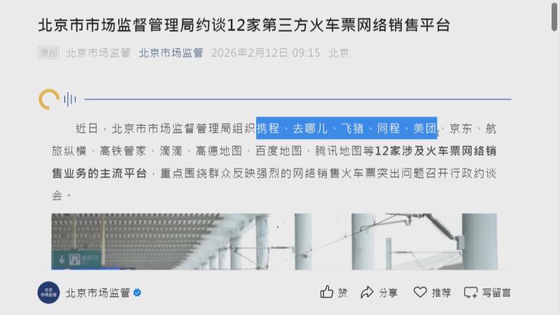 【Now財經台】北京市市場監督管理局約談包括攜程集團(09961)、美團(03690)等,逾10家第三方銷售車票平台,禁止引導消費者付費優先購票等。