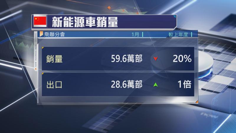 據中國汽車流動協會乘用車市場信息聯席分會數據顯示,內地今年1月新能源車銷量跌20%至逾59萬部,期內,新能源車出口逾28萬輛,大升1倍,佔乘用車出口逾49%。