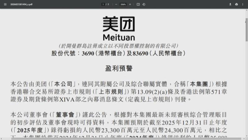 受持續競爭影響,美團上周五(13日)發盈警,預期去年由盈轉虧,最少蝕233億元人民幣,並預期今年第1季將繼續「見紅」,其中,核心本地商業分部虧損介乎68億至70億元人民幣。
