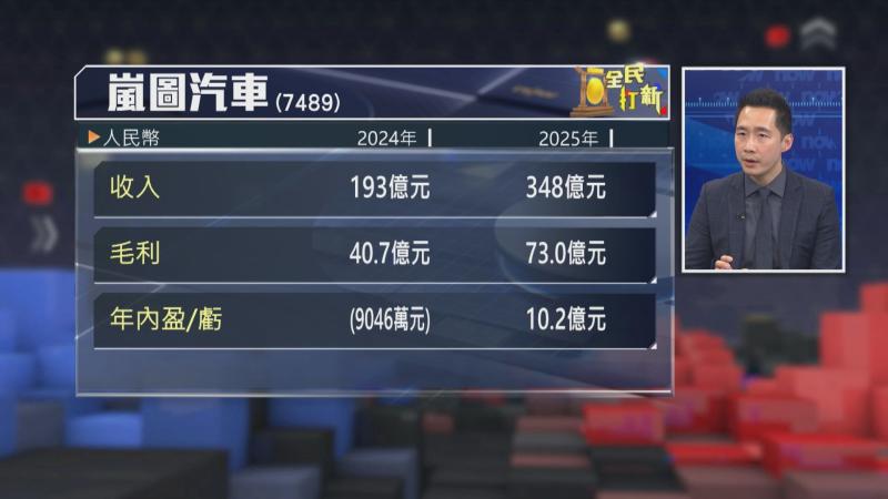 Blue Water Capital投資總監李澤銘指,嵐圖對比其他車企銷量偏低,但勝在成本控制做得好,去年已經實現盈利,毛利率維持喺20%水平,雖然依家內地車市疲弱,但嵐圖業績表現穩健,加上已實現盈利,唔使「燒錢」,有一定優勢。