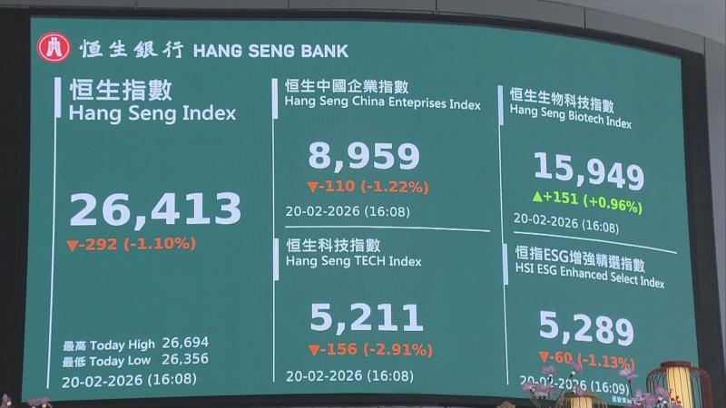 港股今日(20日)於長假期後復市,馬年首個交易日未能迎來「開門紅」,在中東地緣政局緊張的陰霾下,恒指低開48點後,跌幅一度擴大至348點,低見26356點,大部分時間於26500點水平徘徊,收市報26413點,跌292點,失守50天線。在北水「缺席」下,大市全日成交逾1653億元。