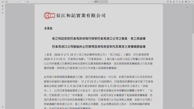 長和表示,獲悉巴拿馬政府於當地時間周一(23日),強行進入由長和附屬巴拿馬港口公司所營運的巴爾博亞港和克里斯托瓦爾港兩個貨櫃碼頭,並且接管碼頭行政及營運控制權,同時禁止公司代表進入碼頭。