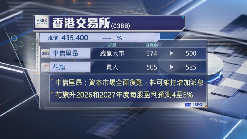 花旗則調高目標價5%至525元,維持「買入」評級,該行因應去年業績及今上月交易數據,調高港交所今、明兩年盈利預測4%至5%,又稱更高的南下港股通交易量,更多的公司上市費,以及倫敦金屬交易所(LME)交投量維持上升趨勢,是調高盈利預測的主要因素。