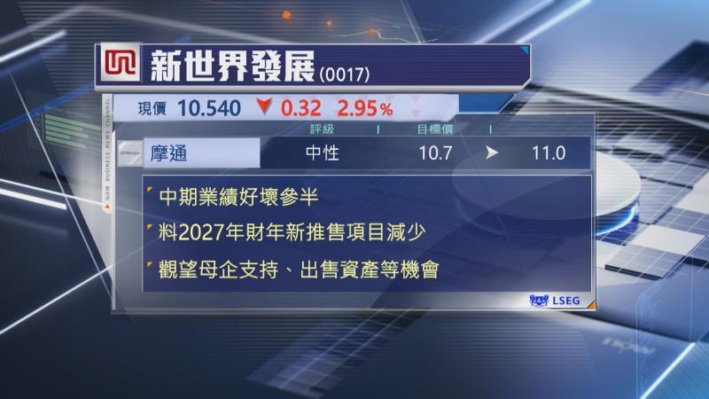 摩通指,新世界中期業績好壞參半,資產負債表仍具挑戰,雖然可受惠於本地樓市氣氛改善,但估計下個財年起新推售項目將會減少,屆時只能靠銷售貨尾,並估計資產負債表持續受利息開支拖累。
