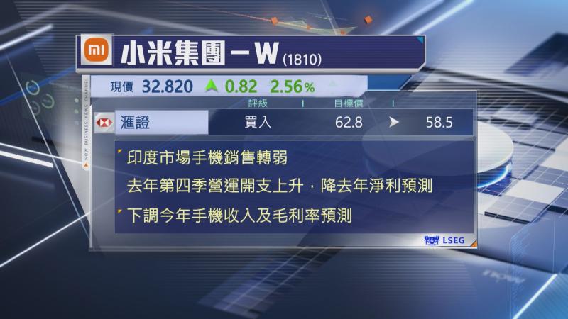 滙證指,考慮到小米智能手機在印度市場銷售轉弱,以及去年第4季較高的營運開支,下調集團去年收入及經調整淨利預測,估計月底公布的業績,去年淨利按年增長40%至381億元人民幣,毛利率22.1%,估計手機收入下跌,均價則持平,又估計全年汽車交付41.4萬部,高於預測水平,但去年第4季平均車價按季跌約8%。
