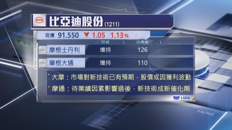 此外,摩根大通亦看好比亞迪新技術,今年可持續推動擴大市佔率,不過,由於臨近公布業績,市場或下調盈利預測,相信要待業績因素影響過後,新技術才有望成為股價催化劑。