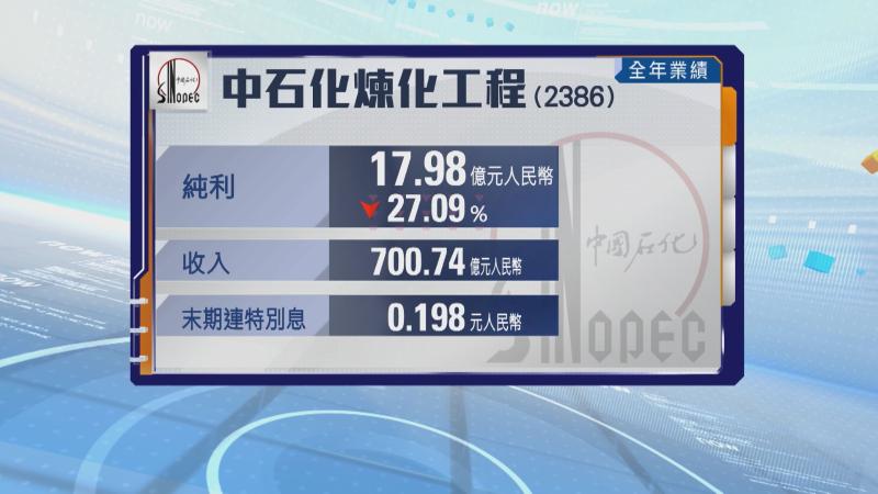 【Now財經台】中石化煉化工程(02386)去年盈利倒退。