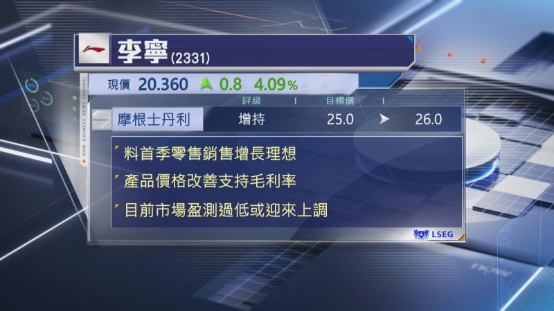 大摩預料,李寧今年首季零售銷售增長將錄中單位數或更高的升幅,與大市同步,比過去兩年集團往往落後市場的表現有所改善,估計在行業龍頭銷售目標更具紀律及更好的庫存管理下,今年第2季起體育用品價格將持續見改善,支持李寧毛利率改善。