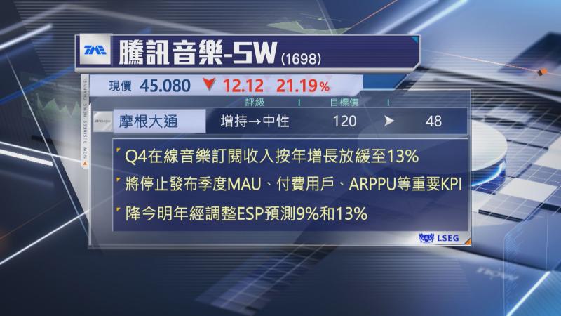 【Now財經台】騰訊音樂(01698)績後被摩根大通大削目標價60%,評級亦由「增持」降至「中性」。