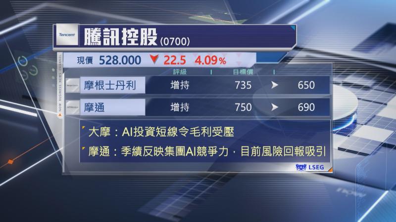 摩根士丹利指,騰訊加大AI投資,短線對毛利帶來壓力,去年180億元投資於AI項目,預料今年的額度會倍升,令今年盈利增速低於收入,但大摩相信,加大投資可釋放長遠的AI業務潛力,雖然下調目標價由735元降至650元,但維持「增持」評級。