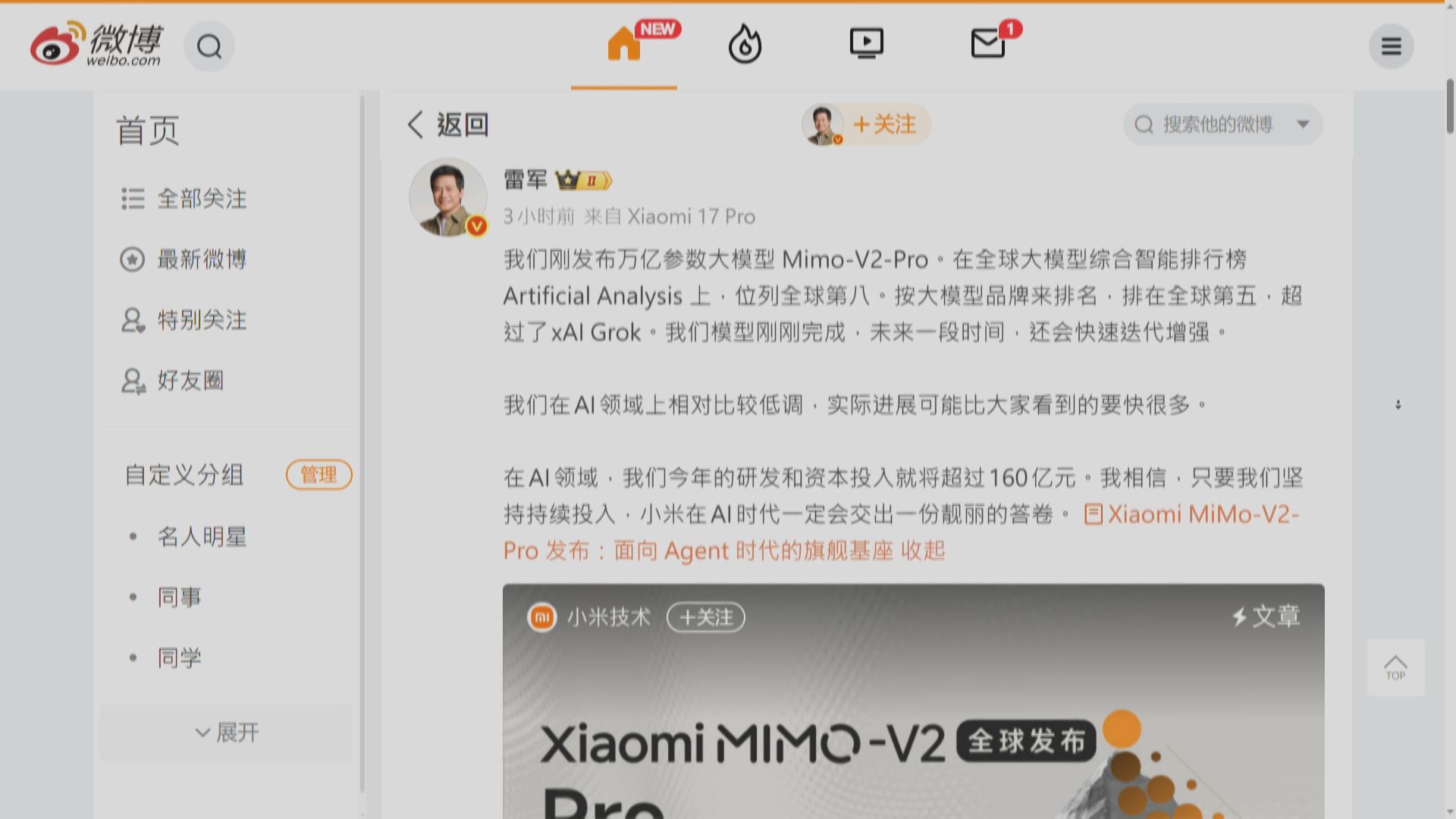 雷軍在微博發文指,最新發布的旗艦基座模型,在全球大模型綜合智能排行榜排第8位,如果按大模型品牌排名,更超越馬斯克(Elon Musk)旗下公司AI模型Grok 4.1,總參數較上一代模型擴大約3倍。