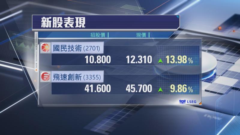 另一方面,公開招股超額認購約1500倍,內地網絡解決方案提供商飛速創新(03355)開市報56元,較招股價41.6元,高逾34%,其後一度高見57元,中午收市報46.48元,高近12%%,每手100股,不計手續費,一手帳賺約488元。
